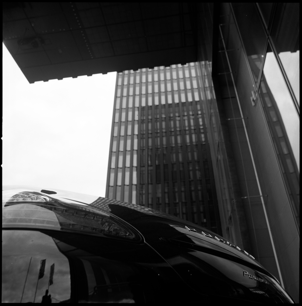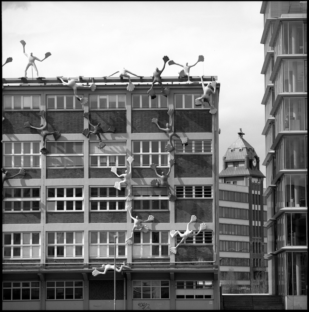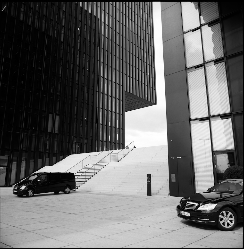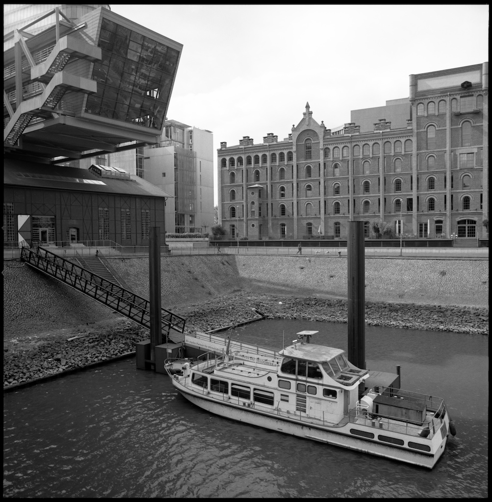 Am Alten Rheinhafen Düsseldorf Am Alten Rheinhafen in Düsseldorf führt eine Holzbrücke auf eine „Halbinsel“ auf der das Hyatt-Hotel steht. Hier ein Rundgang um das alte Hafenbecken mit der Hasselblad auf dem Stativ.